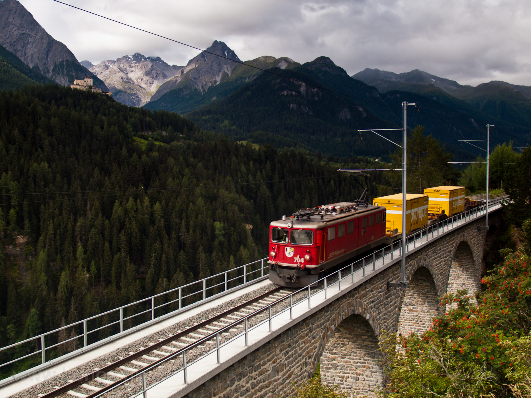 , mivel az könnyen fotózható volt, Ãgy rutinszerzésre pont megfelelt, de sokminden kimaradt akkor még. Próbáltam pont azokon a részeken fényképezni tehát, ahol tavasszal nem tettük meg. A nagyjából észak-déli Oberengadin minden napszakban remek téma, különösen, mivel egy kicsit azért nyugat felé hajlik, ezért, inkább a vonatok oldala kapja a napot, ami tájképeknél jól néz ki. Sajnos viszont az Engadin Star vonatokon kÃvül csak az ütemes menetrendben járó, óránkénti Scuol-Tarasp [skuól-tarasp] - Pontresina [pontrezÃna] ingavonatok vannak, ami ugyan sűrű forgalmat, de dél felé néző vezérlőkocsit jelent. Most viszont az Unterengadin Sagliains utáni, kelet-nyugati szakaszán kezdtem a fotózást, tekintettel a felhőzetre (ami egyébként a négy svájci túrámból eddig csak ezen fordult elő, itt viszont kimondottan a fotózás előnyére tudtam fordÃtani), a napos időben nem fotózható északi fotóhelyeket választottam. A vasút ugyanis, magasan az Inn fölött, a hegy északi lejtőjén halad, Ãgy délről csak alacsonyabbról lehet fényképezni. Északról viszont a viadukt látványa mellett remek hátteret ad Tarasp vára is.