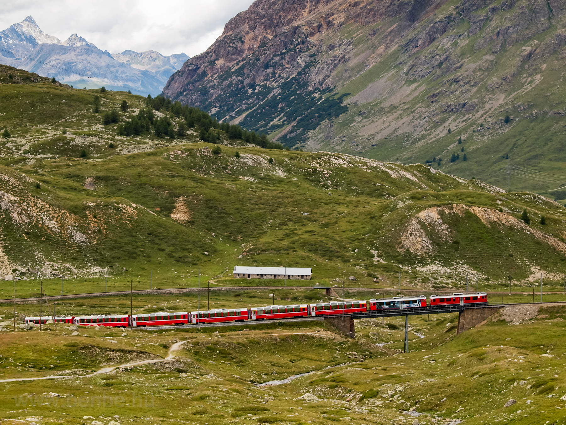 Legyen valami öregebb is: két TW III-as, az ABe 4/4III 54-es és az ABe 4/4III 55-ös a Bernina Express egyik szerelvényével az Obere Berninabachbrückén