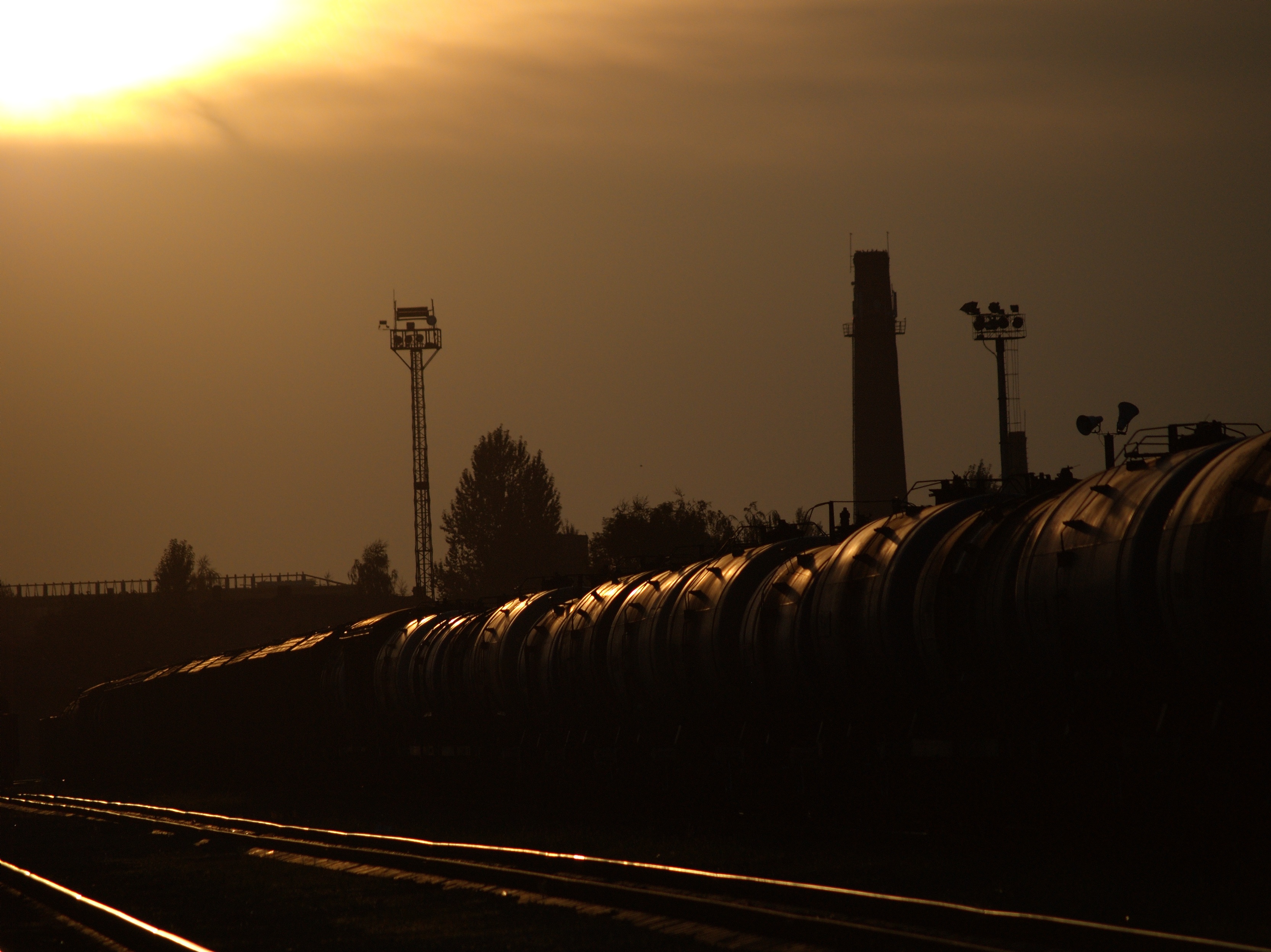 Tehervonat a naplementében Kolomijában