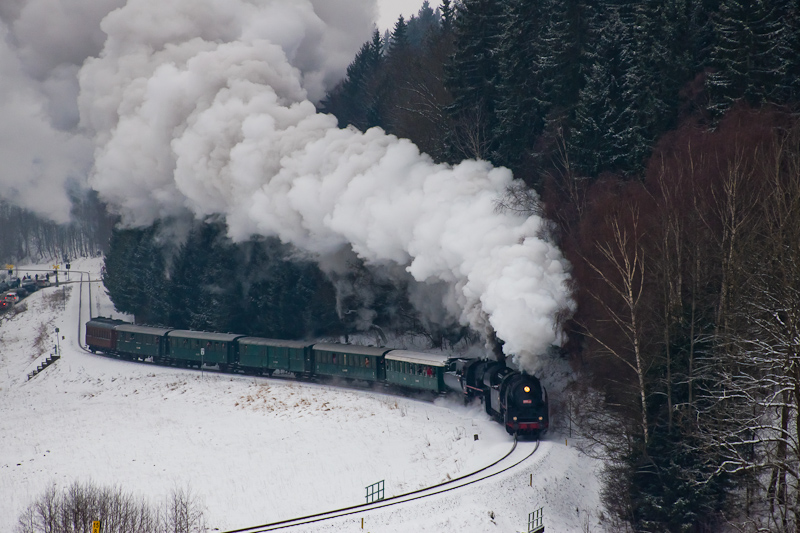 A ČSD 555 129 Branná és Ostružná között a behavazott fenyőerdőben