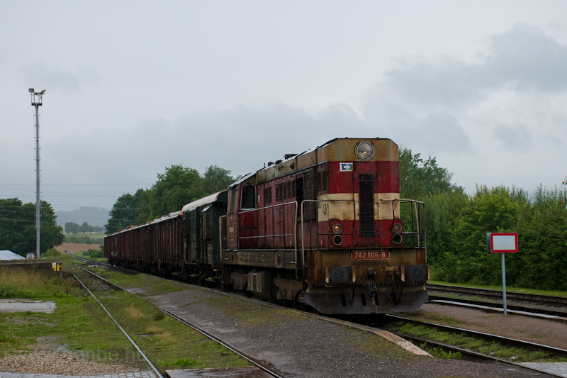 A ČD Cargo 742 106-8 pályaszámú Kocúr a tolatós tehervonattal KrálÃky állomáson