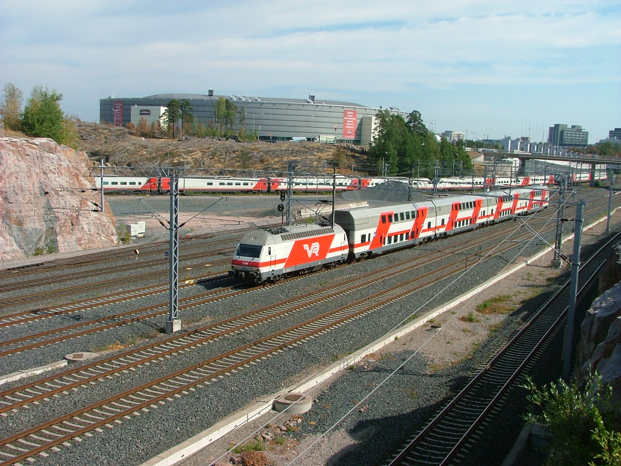 Kezdjünk egy kicsit megismerkedni a Helsinki körüli vasút technológiájával! A képen jól látható, ahogy a főpályaudvarhoz közeli sokvágányos pályára kijár egy Pendolino vonat a járműtelepről. A kép Ilmala megálló felüljárójáról készült. A háttérben a Hartwall Areena.