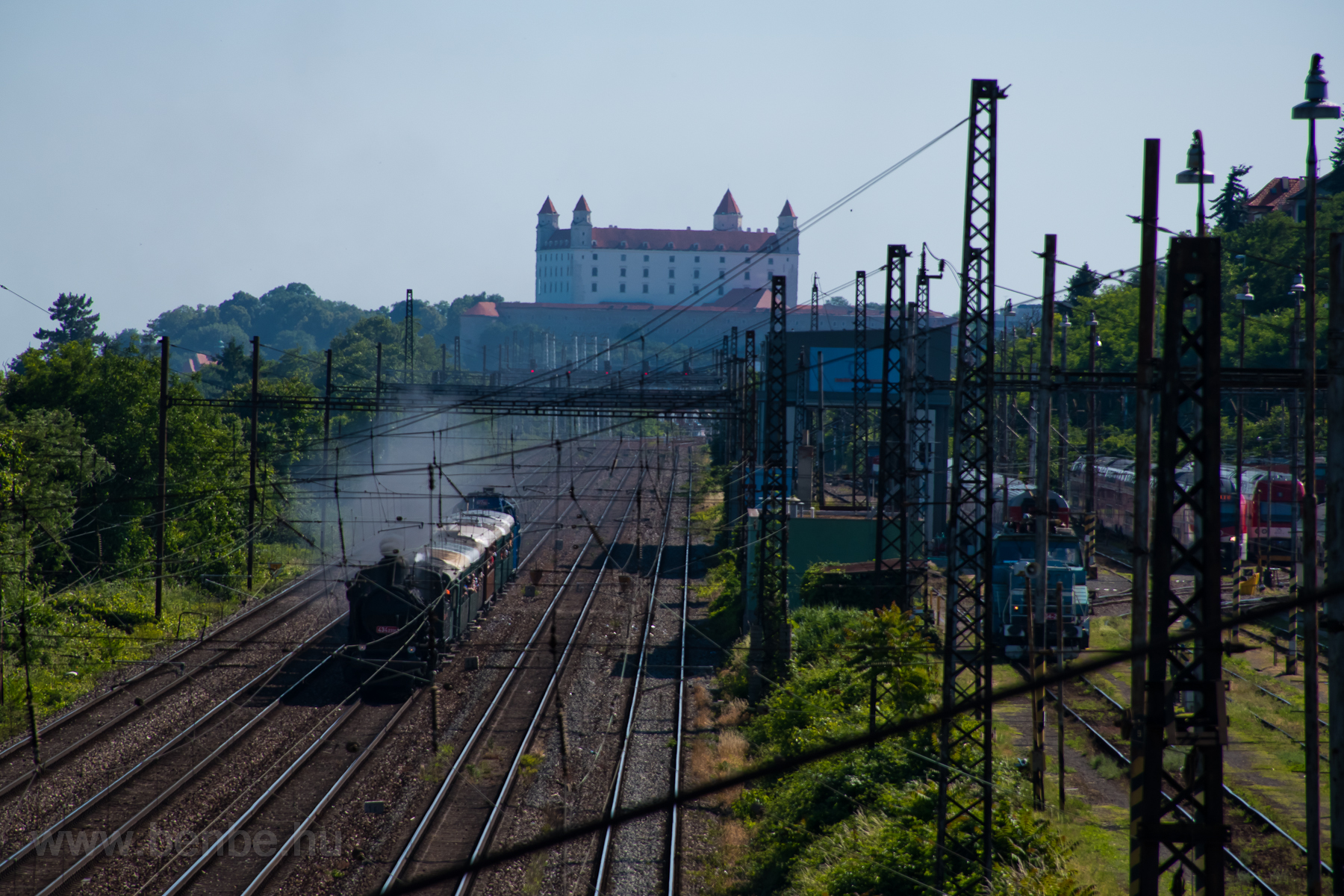 A ČSD 434 2338 Pozsony és Bratislava-Vinohrady között, a háttérben a pozsonyi várral