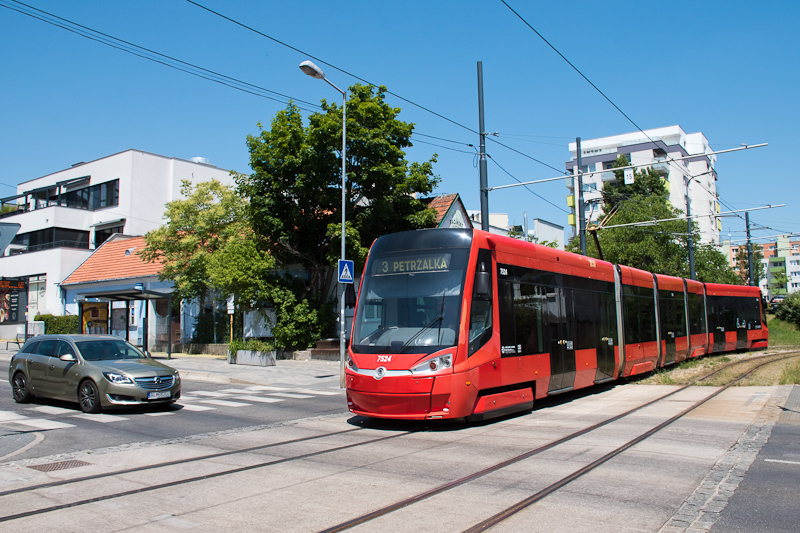 A Mestská hromadná doprava (MHD Pozsony) Škoda 30T 7524 Detvianská megállóhelyen
