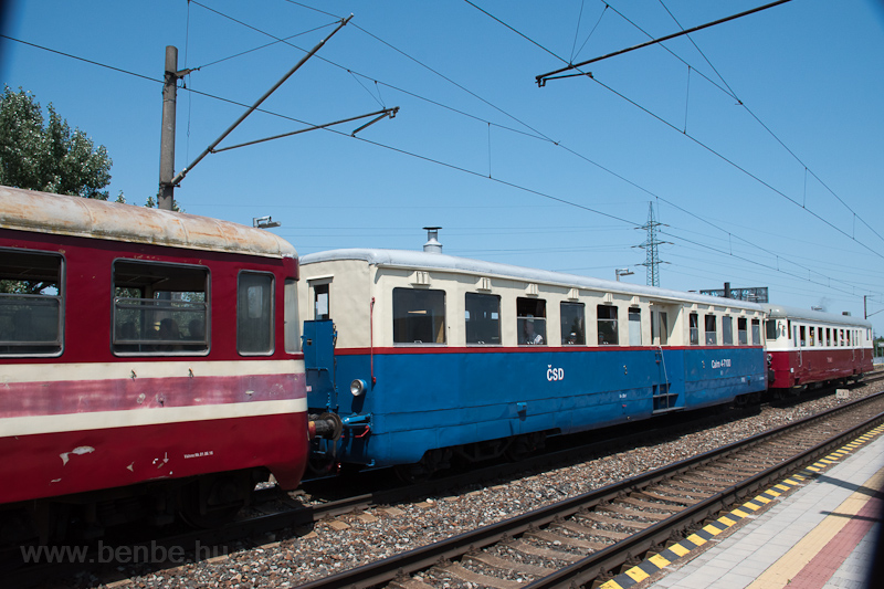 A ČSD Calm 4-7100 Modry ŠÃp motormellékkocsi Bratislava-Vinohrady megállóhelyen