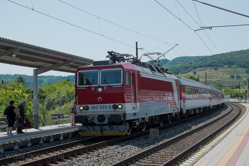 A ŽSSK 362 025-9 Bratislava-Vinohrady megállóhelyen egy besztercebányai gyorsvonattal