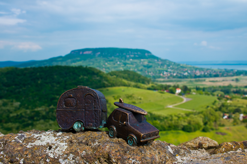 A szigligeti vár Klodoko mini-szobra, a VW Golf és a lakókocsi